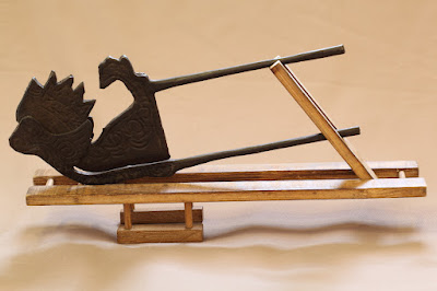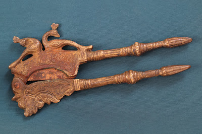 An iron kacip (Balinese) in the shape of a stylized winged horse, with inlaid